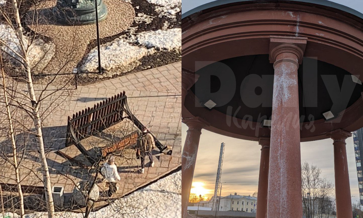 В Петрозаводске ротонда-дублер, быстро построенная на федеральные миллионы в новом сквере, покрылась странными разводами. Также в сквере недавно рухнули качели, а скамейка еле держится. А ведь обустроили место отдыха чуть больше года назад.