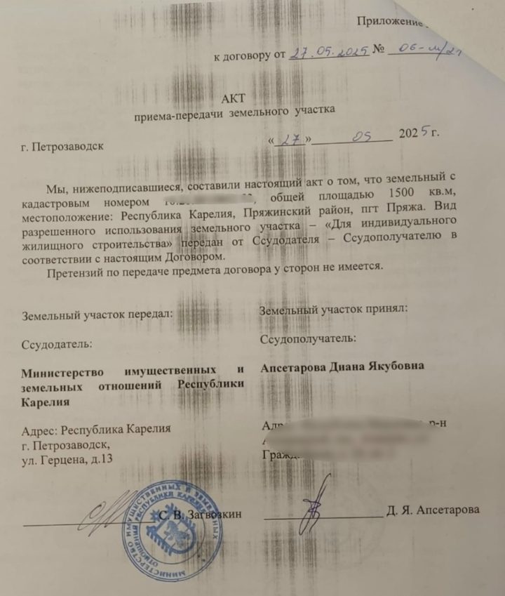 В мае 2025 года семья получила из Управления земельными ресурсами Карелии и Пряжинской администрации все необходимые документы, позволяющие начать строительство дома. Диана обрадовалась, нашла бригаду строителей, даже внесла задаток на строительство, чуть было не заплатила Россетям за проведение электричества на участке. И пригласила кадастрового инженера, чтобы установить границы участка. Инженер огорошил семью новостью о том, что у участка есть второй кадастровый номер. А, самое главное, у земли есть владелец.