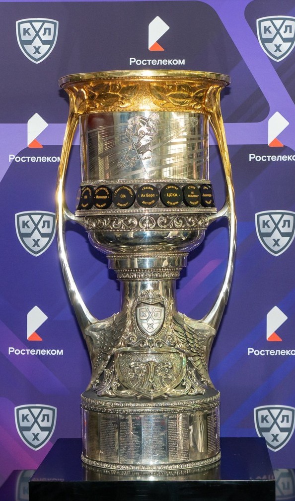 Трофей поражает масштабом: почти метр в высоту, массивный, покрытый благородной позолотой. По бокам — изображения Юрия Гагарина в скафандре и хоккеиста в динамике, а по кругу — маленькие шайбы с именами всех команд-обладателей Кубка с 2009 года.