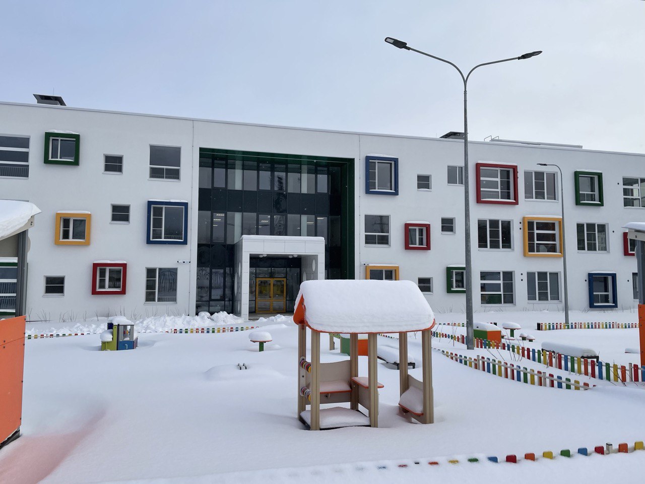 Здание нового детского садика – любопытное, как игрушка. Кажется, нет ни одного стандартного окна, и все в разноцветном обрамлении. Впечатляющий и при этом гармоничный проект – то, что нужно, чтобы развивать воображение и вкус у маленьких петрозаводчан.