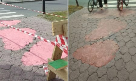 Странные ярко-розовые бетонные заплатки появились в центре Петрозаводска на пересечении проспекта Карла Маркса и улицы Куйбышева ни много ни мало пять месяцев назад. В администрации города тогда убеждали, что это временное решение.