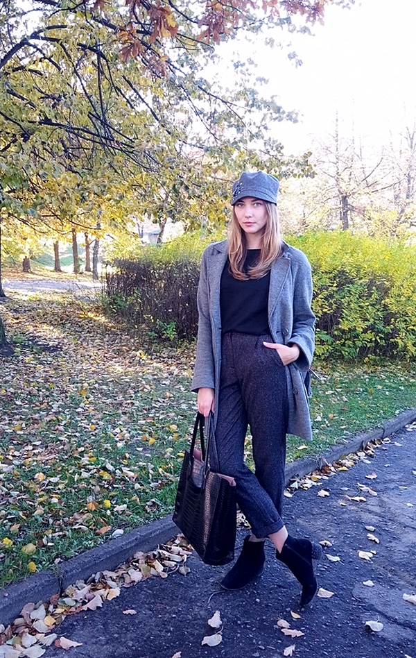 — Сегодня на мне брюки из Bershka, нашла на распродаже, стоили меньше 1000 рублей. Сапоги из Reserved. Футболка из Финляндии, ее нашел на скидках мой младший брат — это так мило. Пальто и кепку отдала мама, ношу с удовольствием уже не первый год.