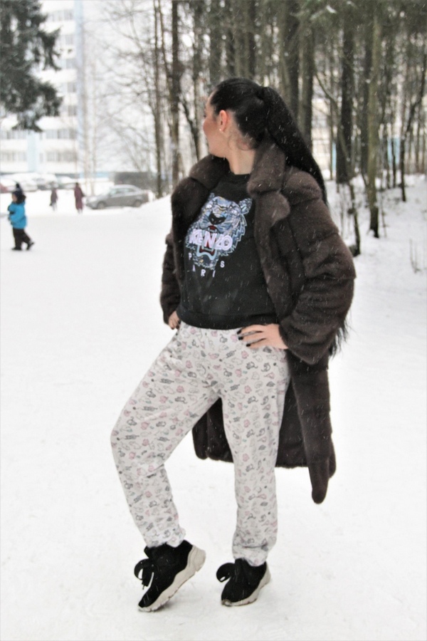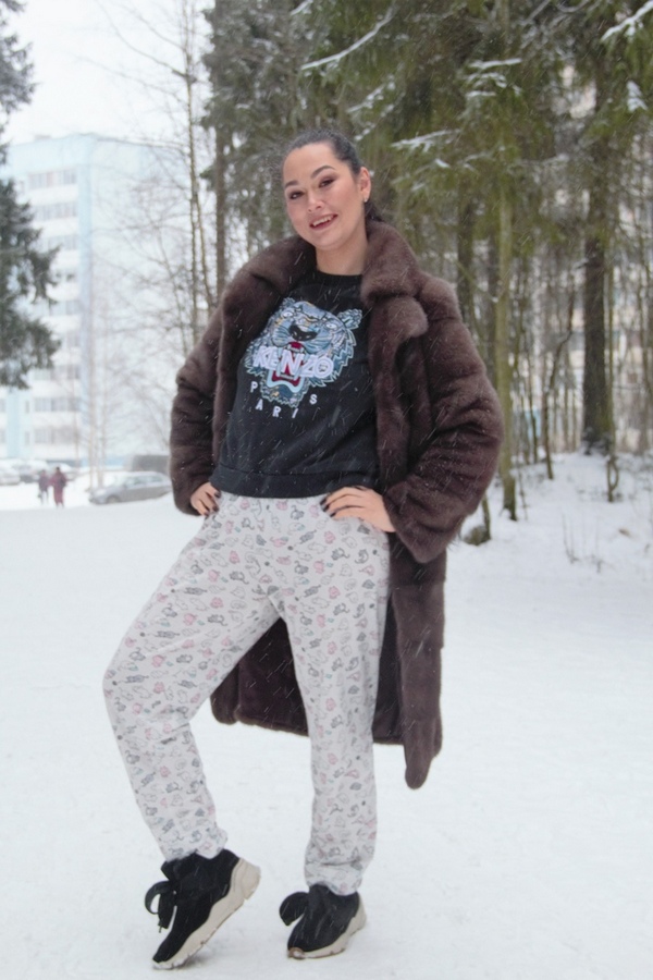 – На мне сегодня: ботинки из Tamarise, стоили 6500. Любимую пижаму из Fun day взяла за 1000. Рюкзак Polo, стоил около 14 тысяч, но по скидке можно найти за 6000. Кофта Kenzo, стоила 17 000. Оригинальная. Хотя хорошие аналоги тоже встречаются и стоят в разы дешевле. Шубку привозили на заказ – очень хотела именно такую. В этих вещах мне тепло, удобно и комфортно. Даже сегодня сделали массу комплиментов моему внешнему виду. Наверное, люди устали от однообразия и относятся к таким веселым нарядам по-доброму.