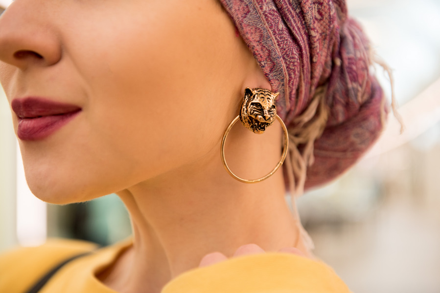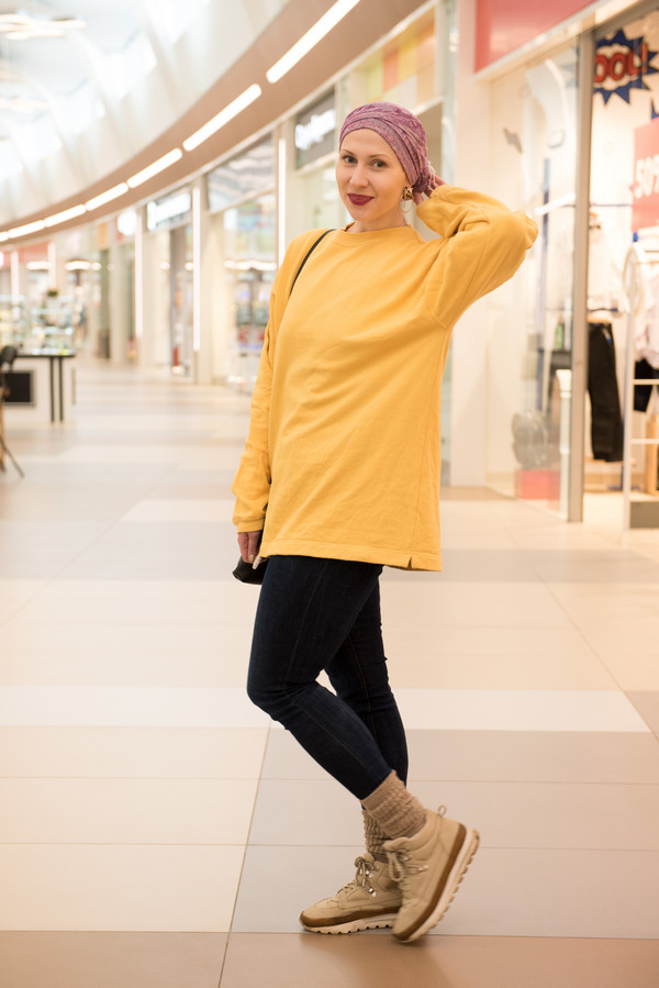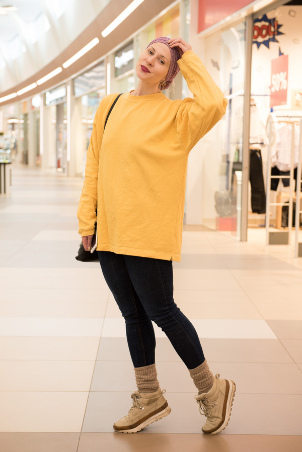 — На мне сегодня джинсы из Stradivarius: повела за одеждой подругу, в итоге накупили вещей вдвоем. Стоили на скидках в районе 1500. Кроссовки Bershka: честно ждала, пока их цена упадет в два раза, взяла за 2000. Кофта из секонда, мужская, большого размера и большого тепла: отдала за нее рублей 300, зато теперь мне тепло, уютно и есть сходство со смайликом цыпленка — идеально. Носки подарил мой фотограф — понятия не имею, где она их достала, но все знакомые теперь хотят такие же. Платок — функциональная часть образа. Куплен мамой на индийской ярмарке. Сделан из шелка и чего-то еще. Обожаю его. И цвет — мой любимый. Сумка Reserved, 600 рублей: на работе кто-то спросил, от какого она дизайнера. Забавно было. Из украшений — серьги Befree. Долго искала крупную бижутерию — эти понравились. Тигры, имитация старинных дверных ручек, ведь ирония — это круто.