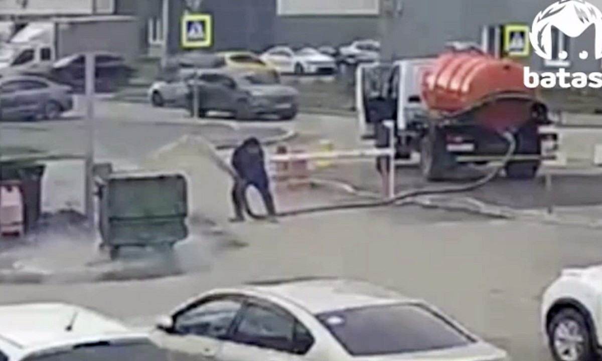 В Уфе ассенизаторы увидели горящий мусорный контейнер, не растерялись и залили подручными средствами — фекалиями из шланга.