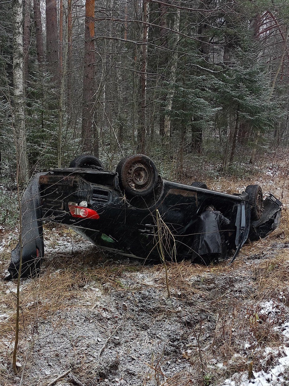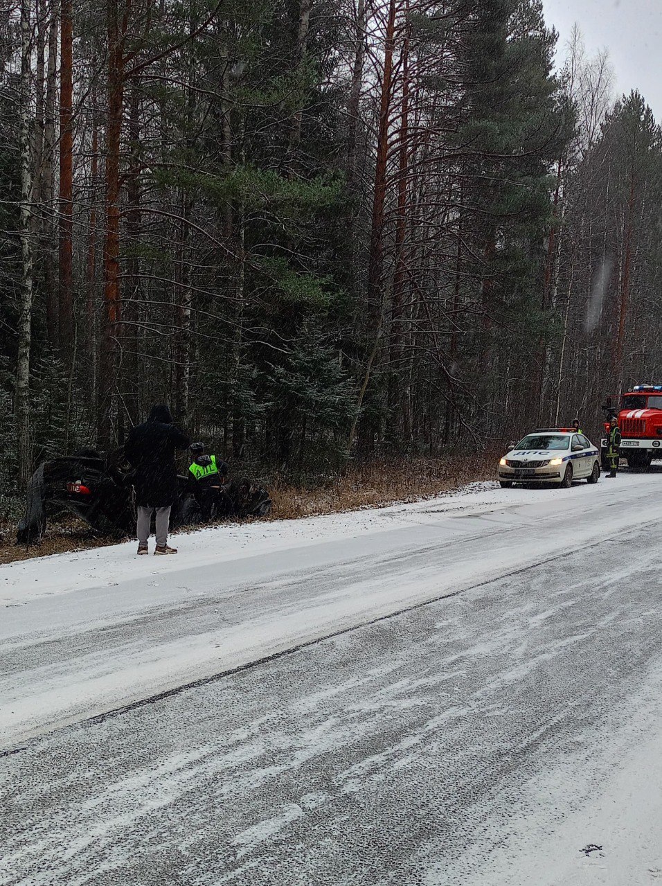 Сегодня днем на дороге ст.Шуйская — Гирвас автомобиль вылетел в кювет и опрокинулся.