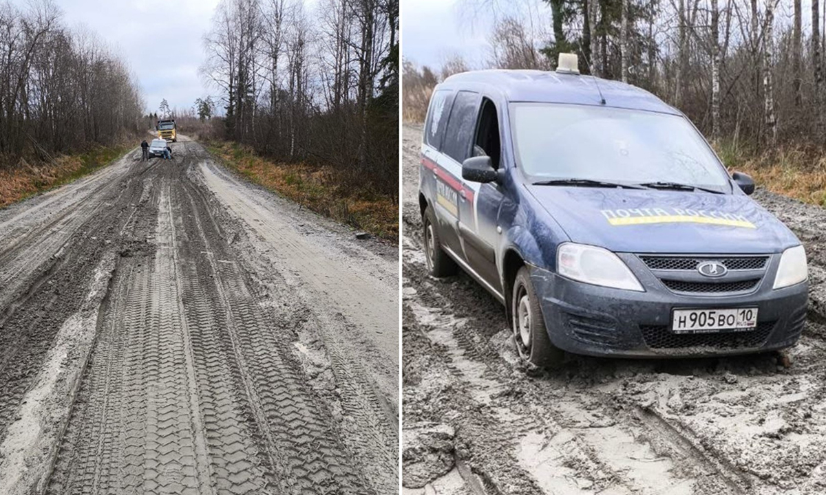 Автомобиль Почты России застрял на ужасной дороге в Карелии