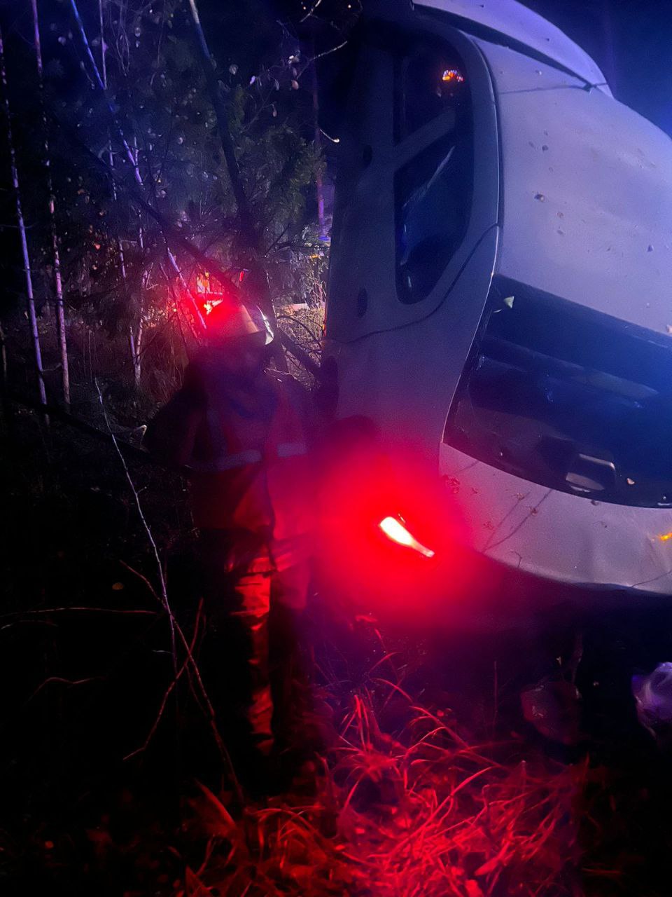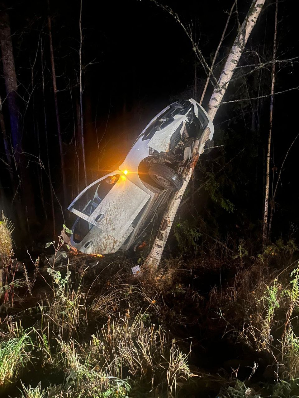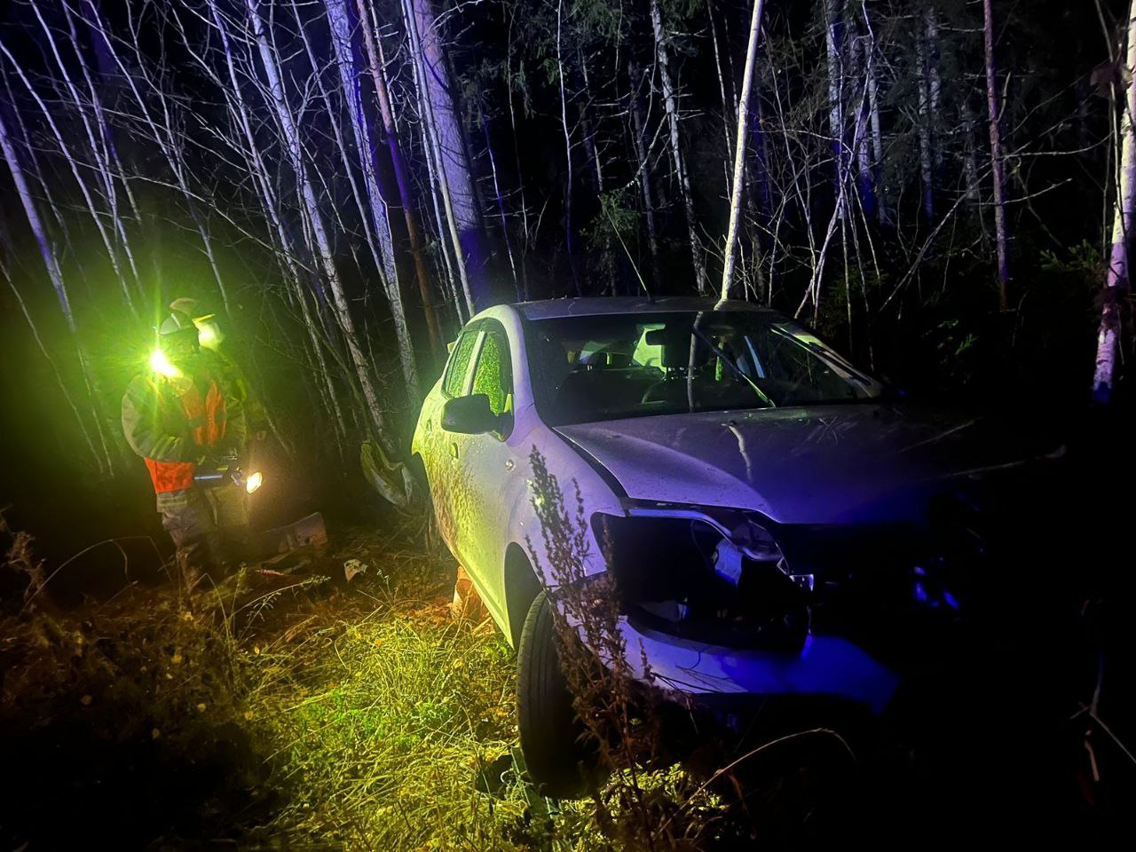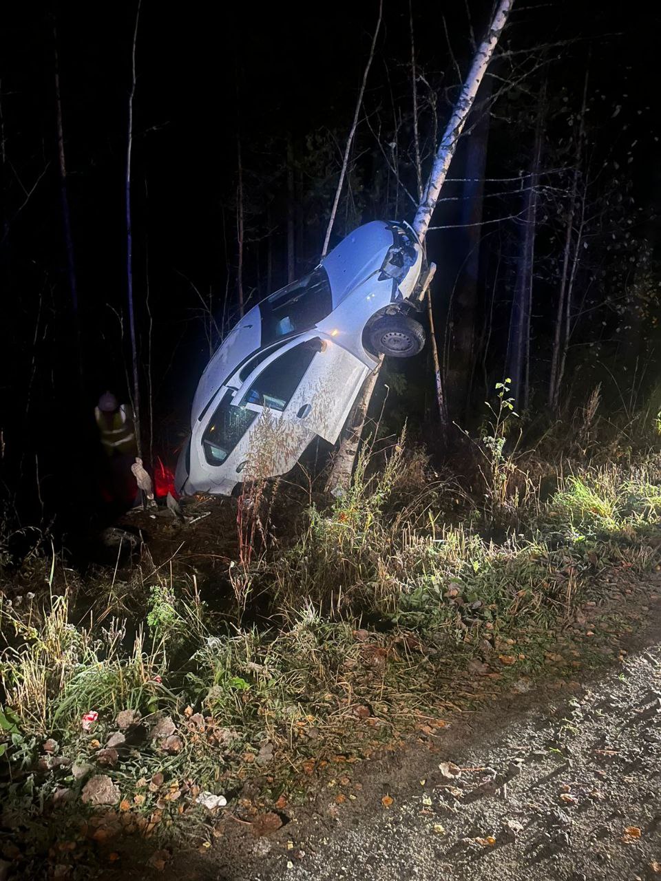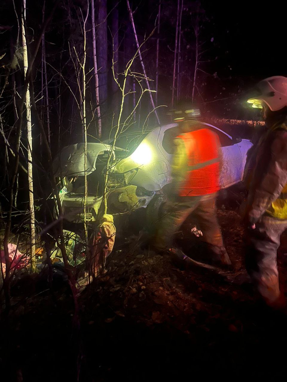 Вчера вечером на 5 км Пиньгубского шоссе автомобиль улетел в кювет и врезался в дерево. На месте работали четверо спасателей из Соломенного: они спустили машину и отключили аккумулятор.