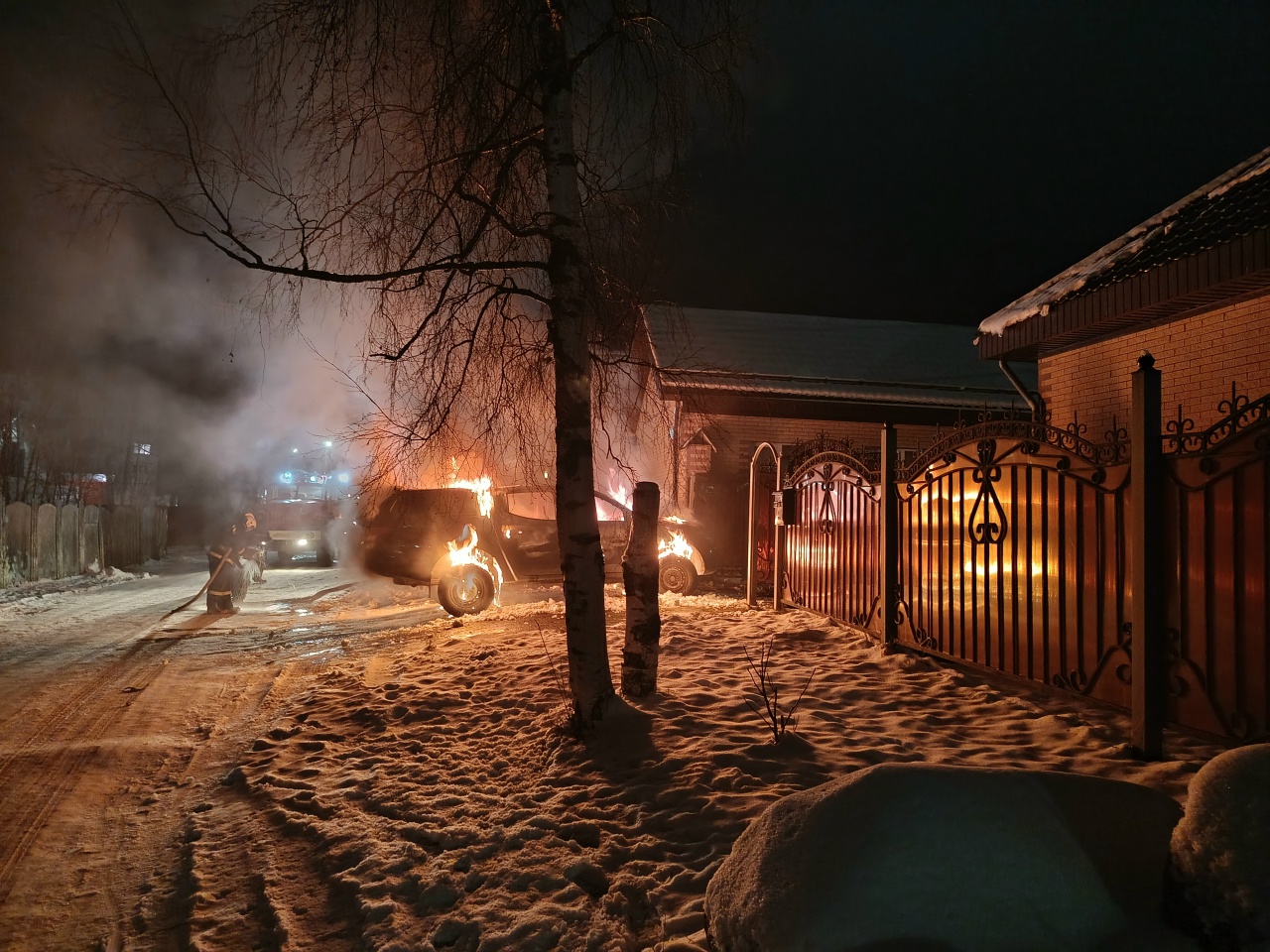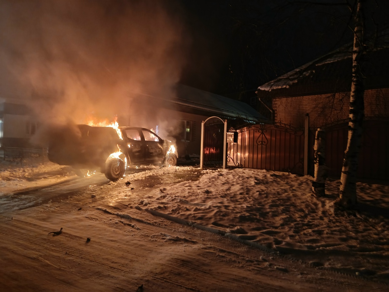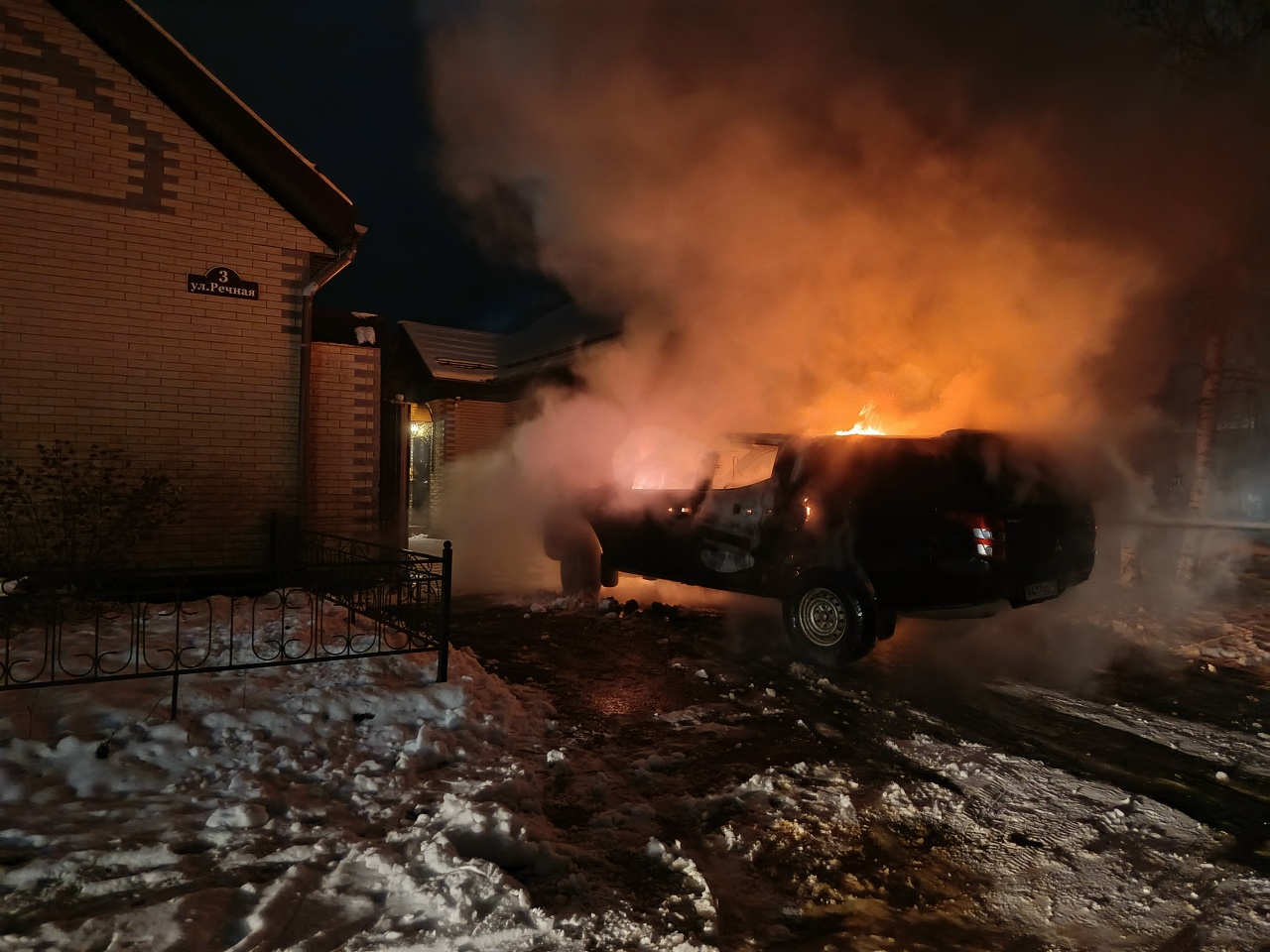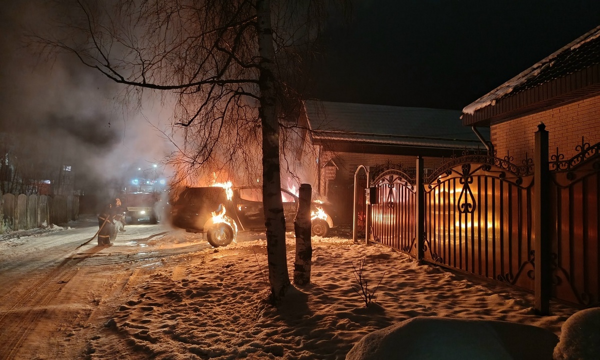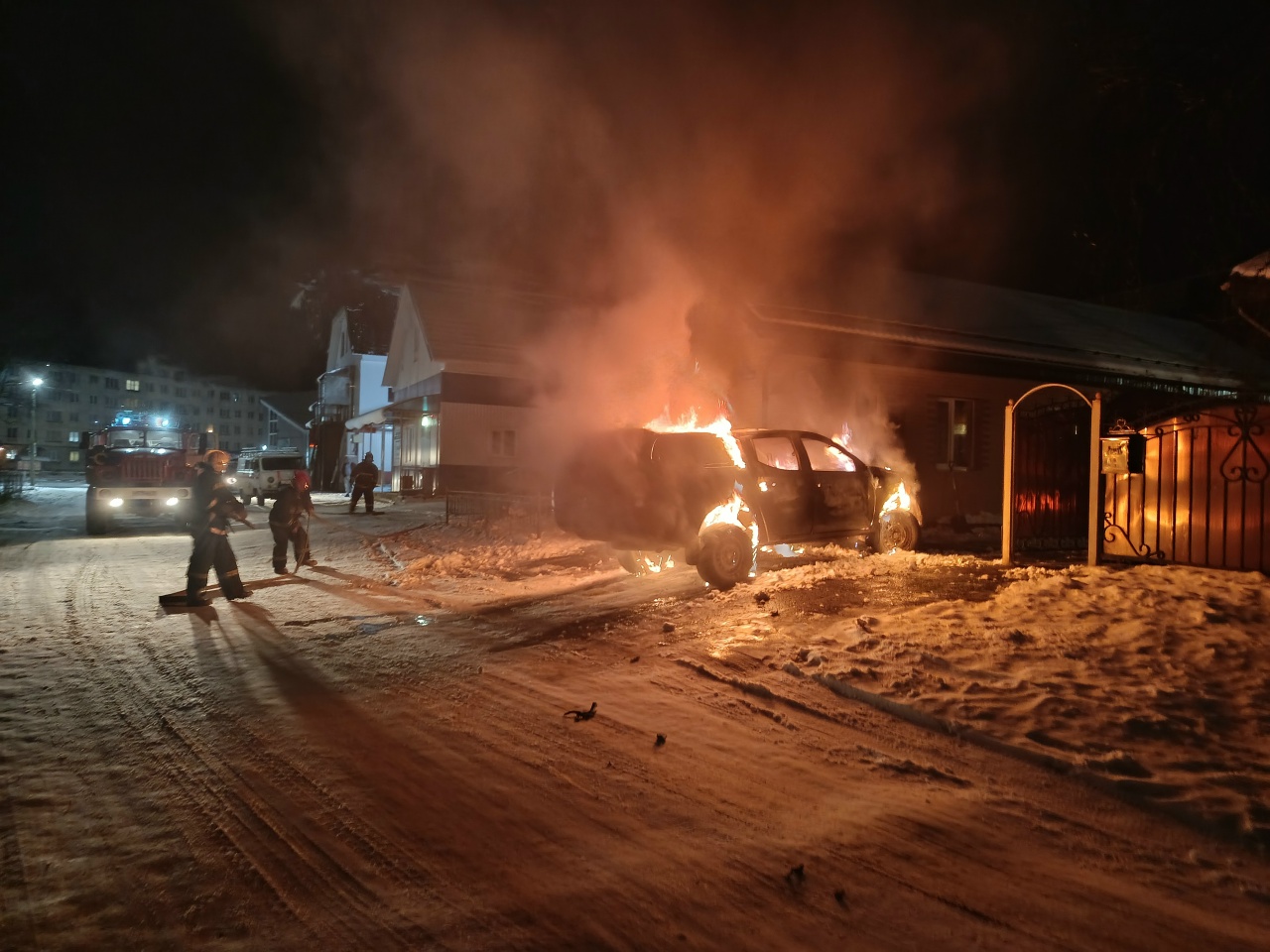 Сегодня ночью в Олонце на ул. Речной, 3 загорелся автомобиль. К приезду спасателей, машина была объята огнем.