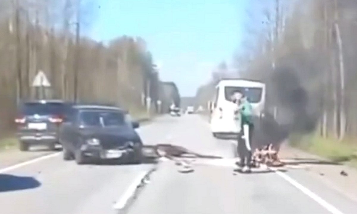 Утром 15 мая на трассе в Ленинградской области погибли мотоциклист и лось. Также на месте аварии находится автомобиль «Жигули» седьмой модели с разбитым бампером.