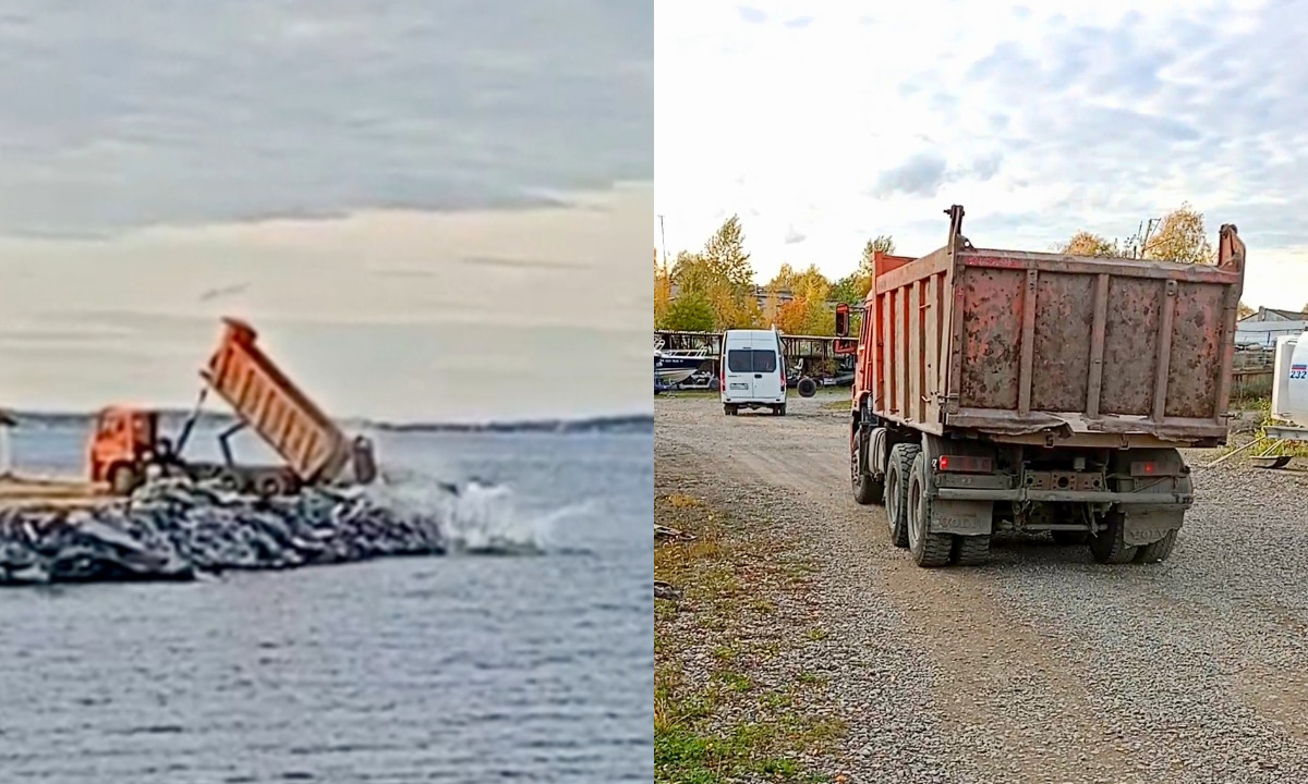 Недавно на прогулке мужчина вновь заметил, как камни скидывают в воду, и сделал фото. На одном из них видно, что на грузовике, вывозящем отходы, нет номеров.