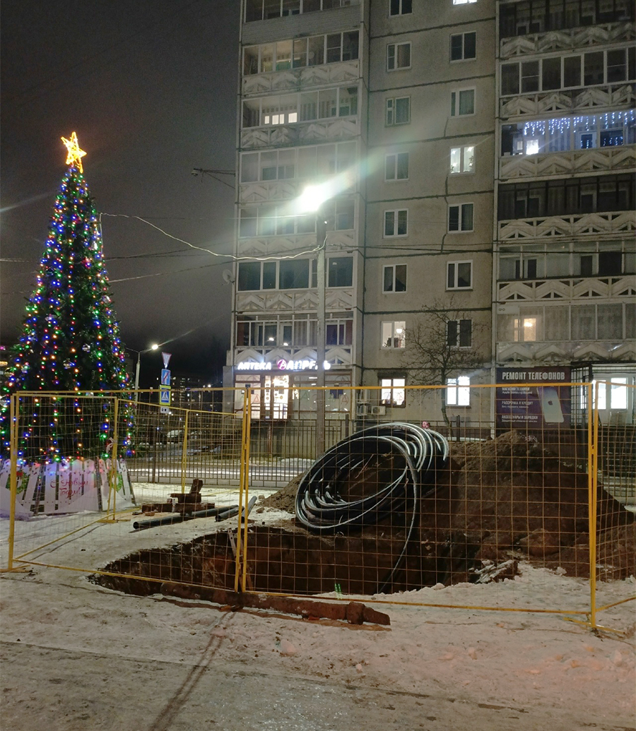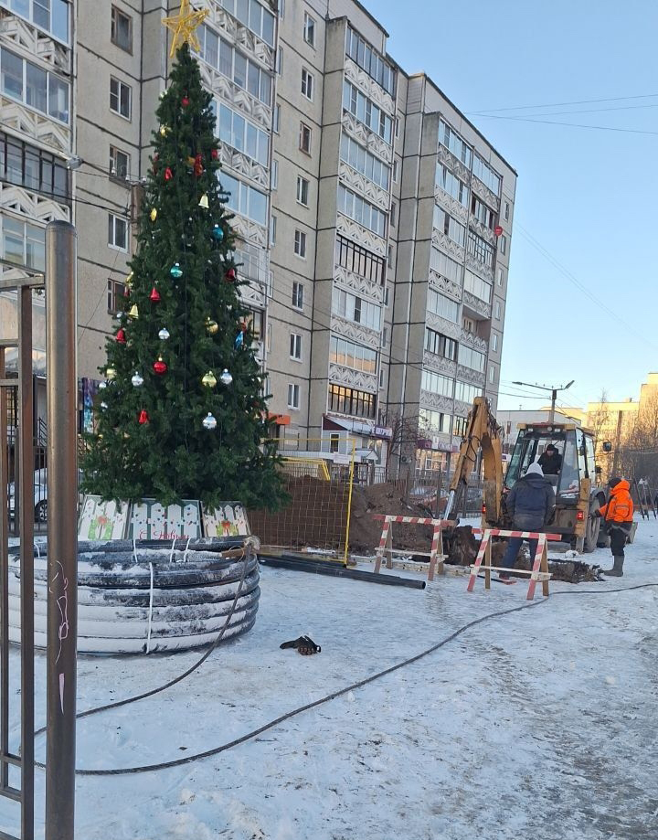 В Петрозаводске на Древлянке у новогодней елки теперь совсем не праздничная обстановка: рабочие вырыли целый котлован.