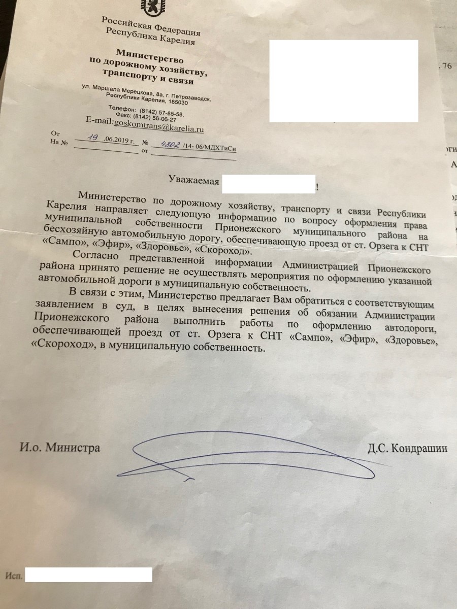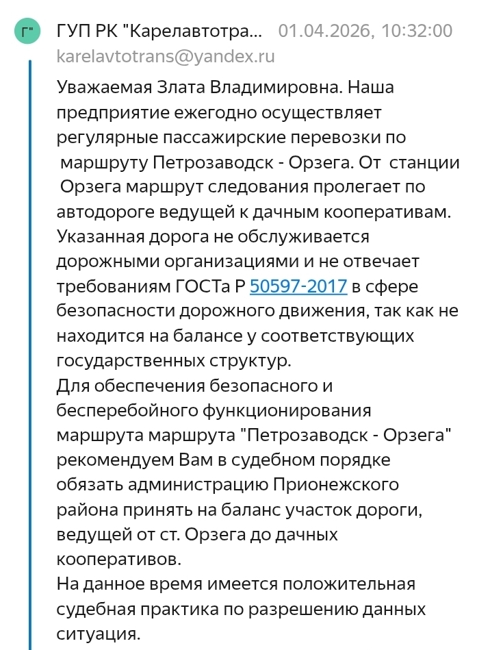 Как сообщает паблик «Отражение. Карелия», дорога длиной четыре километра проходит по территории федерального лесного фонда, арендованного лесозаготовителями ООО «Приоритет». Компания и министерство по дорожному хозяйству, транспорту и связи РК не стали возражать против передачи дороги муниципалитету. Однако в 2019 году Прионежский районный суд отказал в принудительной передаче дороги на баланс района, так как у администрации нет денег на ее содержание.
