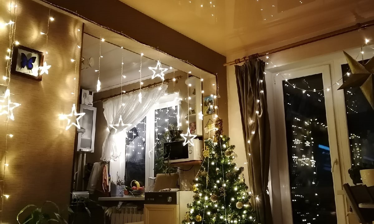 Для украшения окон или стен лучше выбрать гирлянду «бахрома» (нити гирлянды разной длины) или «занавес» (нити одинаковой длины) — обе лучше крепить на прозрачные присоски. Для стандартного окна хватит гирлянды размером 2,4 метра на 60 сантиметров.