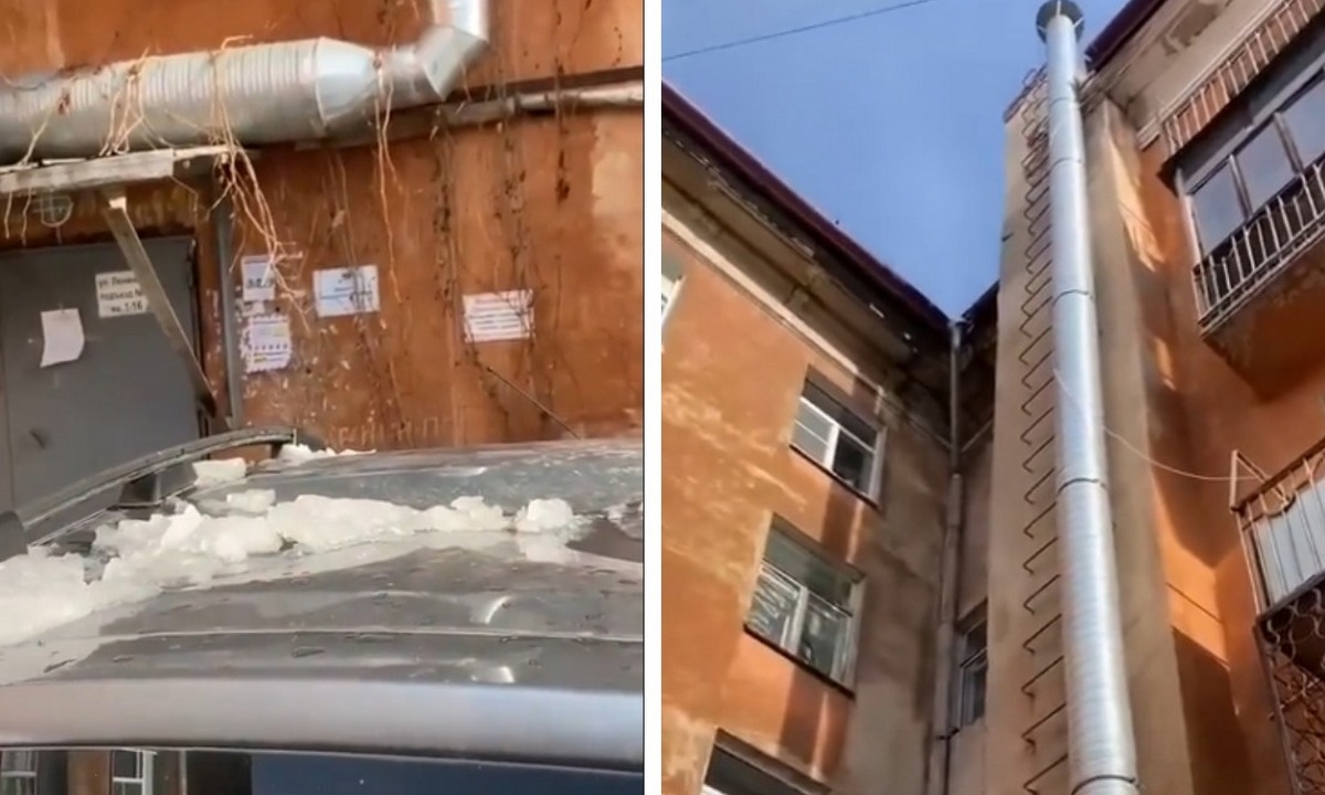 Глыба с крыши упала на машину, припаркованную во дворе на проспекте Ленина. На крыше осталась вмятина.