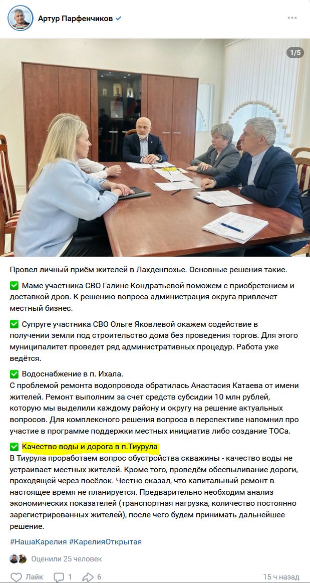 — В Тиурула проработаем вопрос обустройства скважины — качество воды не устраивает местных жителей. Кроме того, проведем обеспыливание дороги, проходящей через поселок. Честно сказал, что капитальный ремонт в настоящее время не планируется. Предварительно необходим анализ экономических показателей (транспортная нагрузка, количество постоянно зарегистрированных жителей), после чего будем принимать дальнейшее решение, — написал губернатор на своей странице во «ВКонтакте».