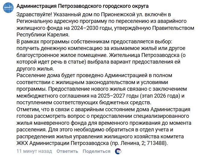 В администрации Петрозаводска заявили, что собственникам аварийного дома предоставляется выбор: получить денежную компенсацию или другое благоустроенное жилое помещение. По их словам, Валентина выбрала второй вариант. Чиновники отметили, что в мэрии готовы предоставить жилье для временного проживания до момента расселения — для этого нужно обратиться в отдел учета и распределения жилья управления жилищного хозяйства комитета ЖКХ.