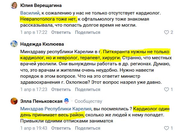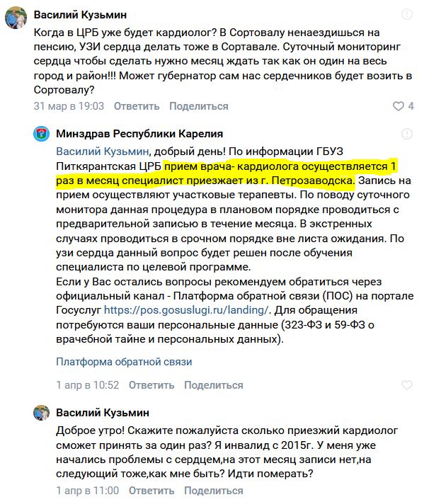Как рассказал Василий Кузьмин в комментариях на странице губернатора Карелии, жителям Питкярантского района приходится ездить на прием к кардиологу и УЗИ сердца в Сортавалу, так как специалиста просто нет. Чтобы пройти суточный мониторинг (ЭКГ по Холтеру)— довольно частое назначение кардиологов — люди вынуждены ждать месяц, так как на весь район монитор есть только один.