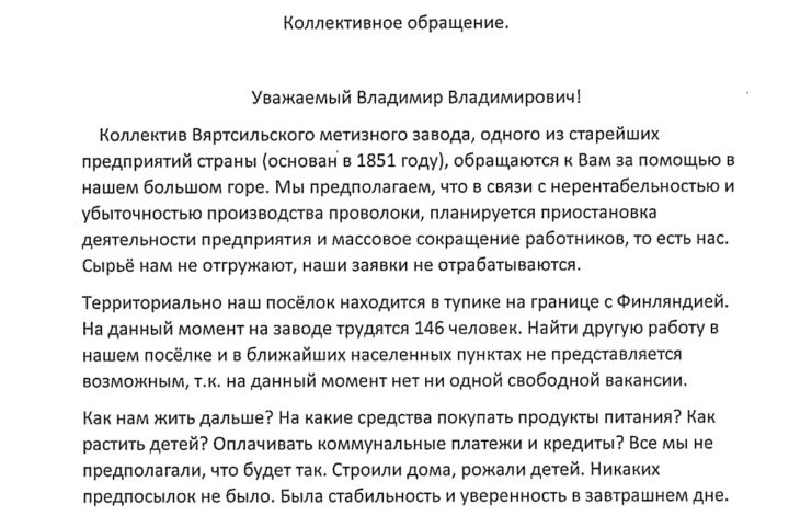 — Территориально наш посёлок находится в тупике на границе с Финляндией. На данный момент на заводе трудятся 146 человек. Найти другую работу в нашем посёлке и в ближайших населенных пунктах не представляется возможным, т.к. на данный момент нет ни одной свободной вакансии. Как нам жить дальше? На какие средства покупать продукты питания? Как растить детей? Оплачивать коммунальные платежи и кредиты? Все мы не предполагали, что будет так. Строили дома, рожали детей. Никаких предпосылок не было. Была стабильность и уверенность в завтрашнем дне. Для многих из нас этот завод является не просто родным предприятием, на котором мы профессионально выросли и состоялись, на котором работали наши родители, бабушки, дедушки, наши дети, оно еще и часть истории нашего поселка, наша гордость, наша слава. Для многих из нас это еще и единственный источник дохода: некоторые из нас работают здесь семьями и не одно десятилетие. В числе работников также есть те, кто сейчас защищает нашу родину на специальной военной операции, — написали сотрудники завода.