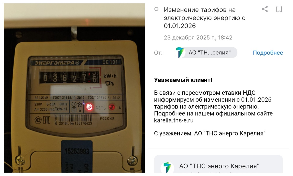 В разгар новогодних хлопот жители Карелии обнаружили, что компания «ТНС энерго» вновь повысит тарифы на электроэнергию, хотя последнее повышение было всего полгода назад — в июле 2025 года. Скриншот с электронным письмом от компании прислал возмущенный горожанин в паблик «Подслушано в ПТЗ». В письме указано, что тариф вырастет из-за «пересмотра ставки НДС».