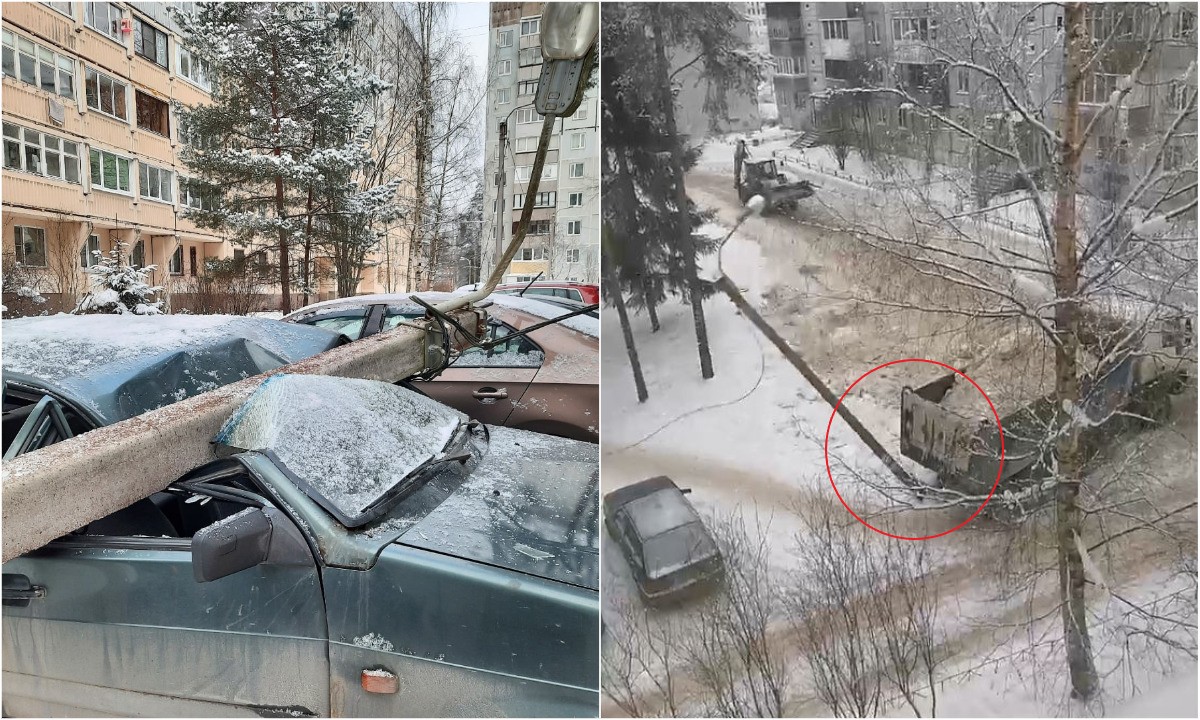 Женщина случайно засняла, как самосвал повалил столб на припаркованную «Ладу» во время уборки снега. Людей чудом не прибило насмерть.
