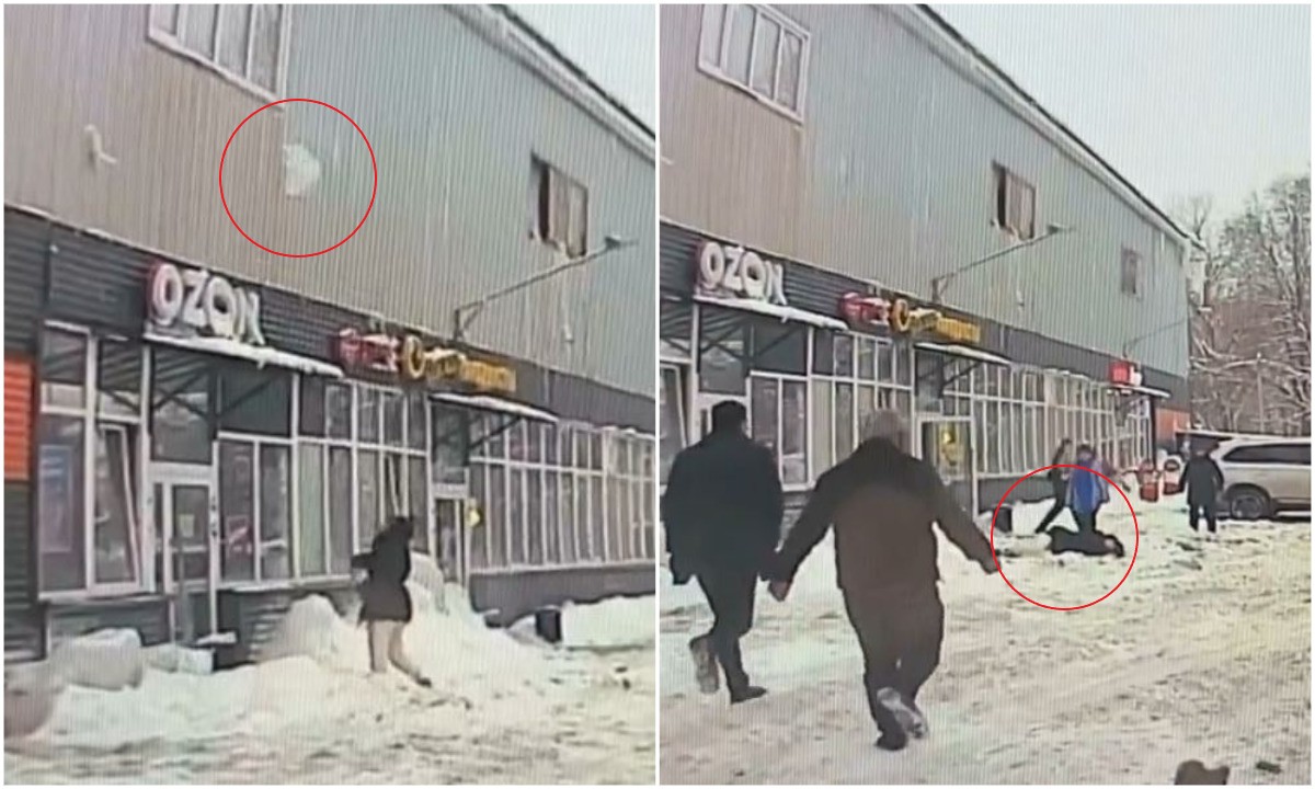 Ледяная глыба чуть не убила девушку: она заметила опасность, но не смогла защититься. Пострадавшей зашивали голову в больнице.