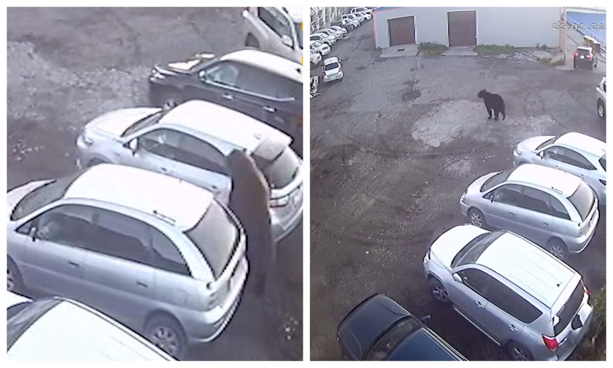 После этого хищник отправился на парковку, где набросился на мужчину, тот чудом успел запрыгнуть в машину и закрыть дверь, медведь смог повредить только стекло и крыло авто.