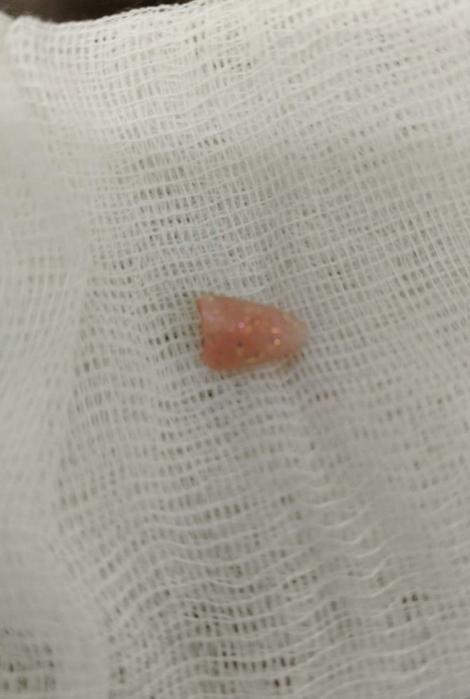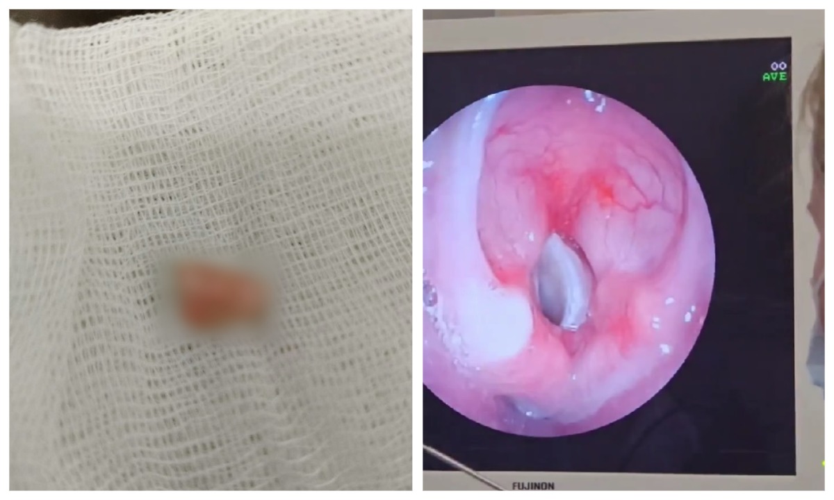 Ребенка с хрипами и тяжелым дыханием срочно доставили в больницу. Врачи увидели в голосовой щели плотный твердый предмет, перекрывавший дыхание на 80%. Гибким эндоскопом его вытащить не удалось, медикам пришлось делать экстренную операцию и вытаскивать инородное тело жесткими щипцами.