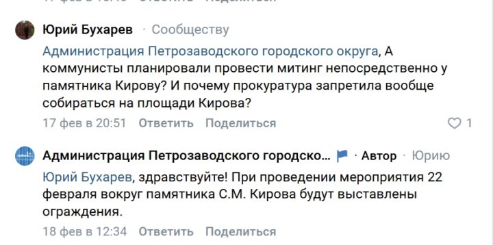В соцсетях же представители мэрии сначала заявляли, что масленичные гуляния будут проводится не у памятника Кирова, а потом, что у памятника будут выставлены ограждения.