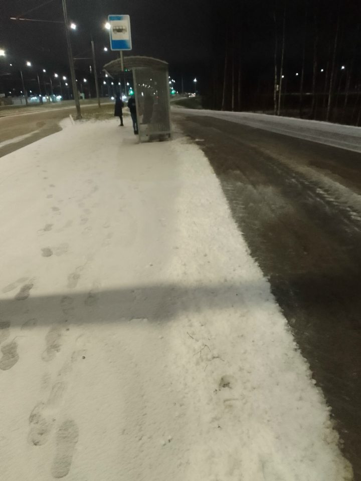 Житель Петрозаводска обратил внимание на то, как странно почистили остановку на улице Генерала Терехина: за остановкой теперь чисто, а там, где люди ждут и садятся в транспорт, — снег.