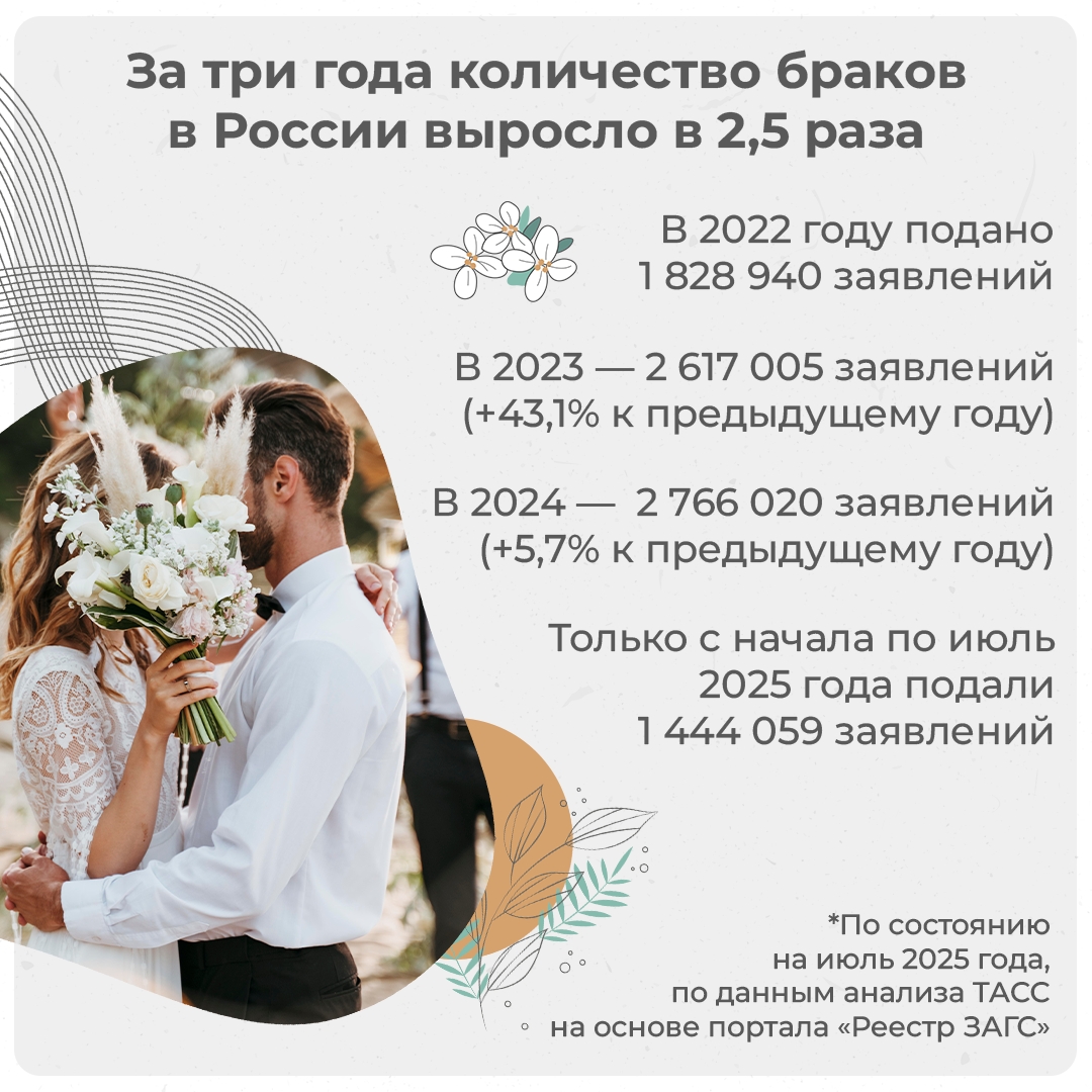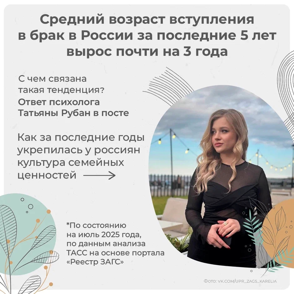 В 2025 году средний возраст невест составил 33,2 года, а женихов — 35,3 года. Как сообщила в своем «Телеграме» Татьяна Тимофеева, начальник Управления ЗАГС Карелии, за последние пять лет средний возраст вступления в брак вырос почти на три года.