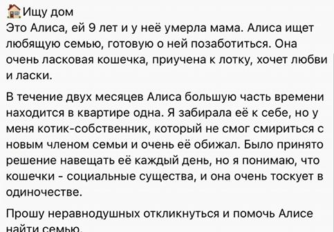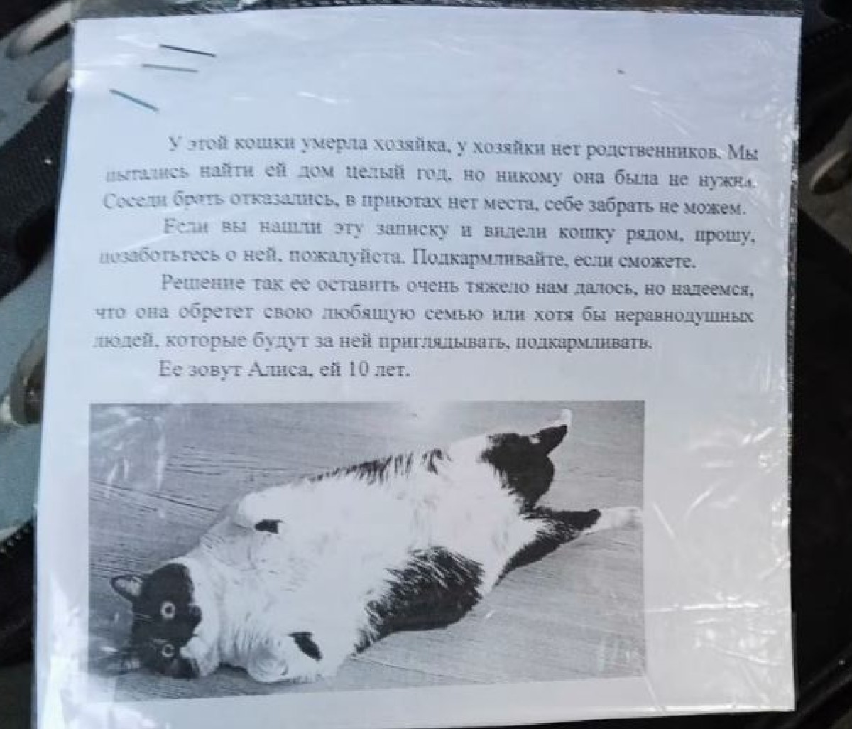 — Если вы нашли эту записку и видели кошку рядом, прошу, позаботьтесь о ней, пожалуйста. Подкармливайте, если сможете. Решение так ее оставить очень тяжело нам далось, но надеемся, что она обретет свою любящую семью или хотя бы неравнодушных людей, которые будут за ней приглядывать, подкармливать, — было сказано в записке.