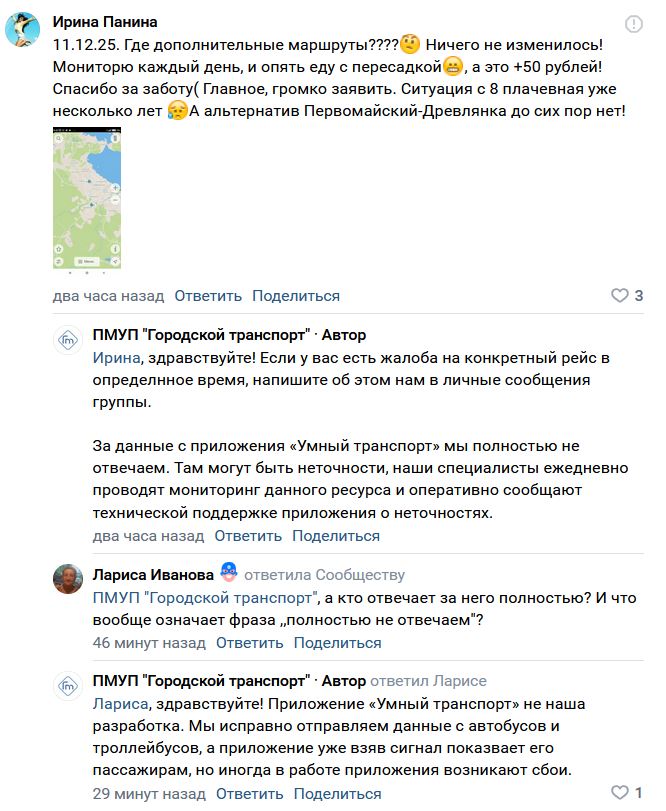 В «Городской транспорте» заявили, что пожаловаться на конкретный рейс можно в личные сообщения группы, а также отметили, что они полностью не отвечают за данные с приложения «Умный транспорт».
