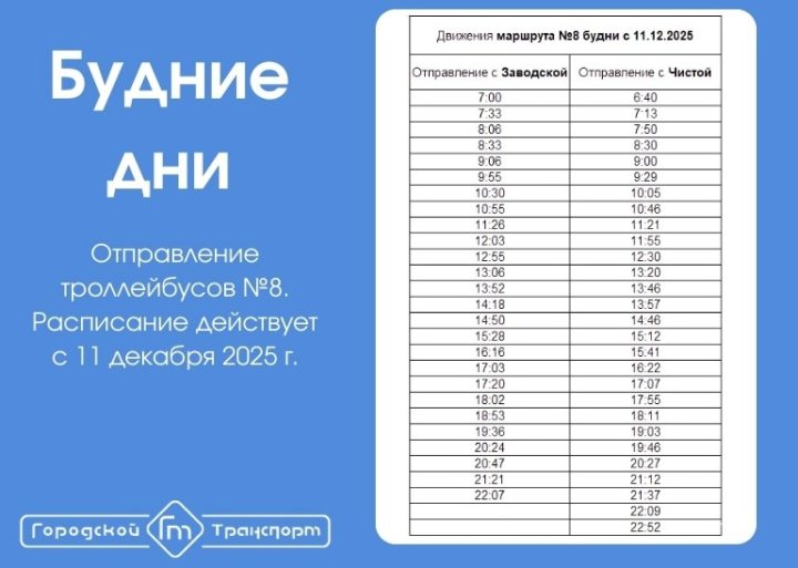 ПМУП «Городской транспорт» сообщил, что с 11 декабря троллейбус № 8 будет ходить по новому расписанию. «Восьмерке» добавили утренние и вечерние рейсы, чтобы горожане успевали на работу и учебу, а после могли спокойно уехать домой. Время работы в час‑пик увеличили на три часа, а интервалы — сократили. Также добавлен рейс в 22:09 — для сотрудников ТРК «Лотос Плаза».