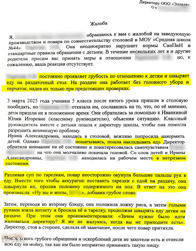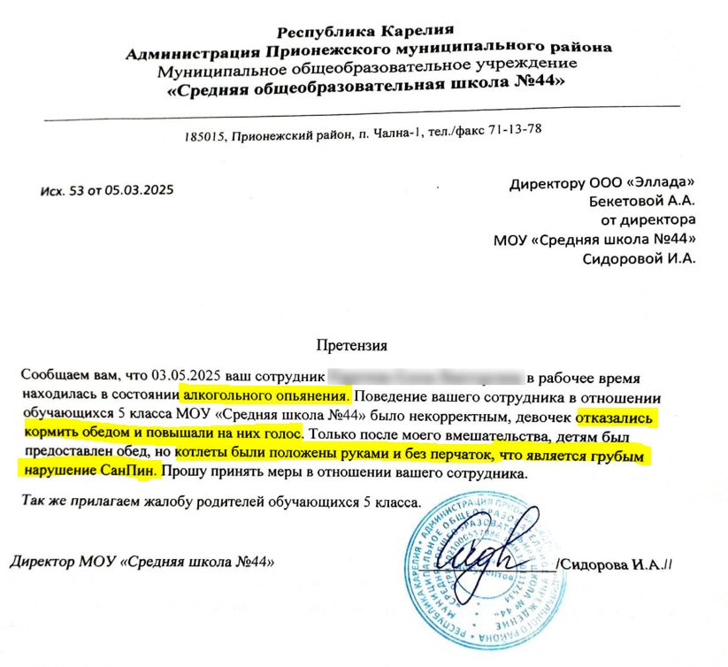 Оказалось, на сотрудницу столовой жалуются не в первый раз: в марте этого года директор школы отправляла претензию директору предприятия ООО «Эллада», которое занимается организацией питания детей. В ней было указано, что заведующая столовой была в нетрезвом состоянии в рабочее время, отказалась кормить пятиклассников, повысила на детей голос и клала котлеты руками без перчаток. К этой претензии директор также приложила жалобу, написанную родителем одного из пятиклассников. По словам матери, заведующая грубит детям, швыряет еду на стол, а на раздаче работает без головного убора и перчаток.