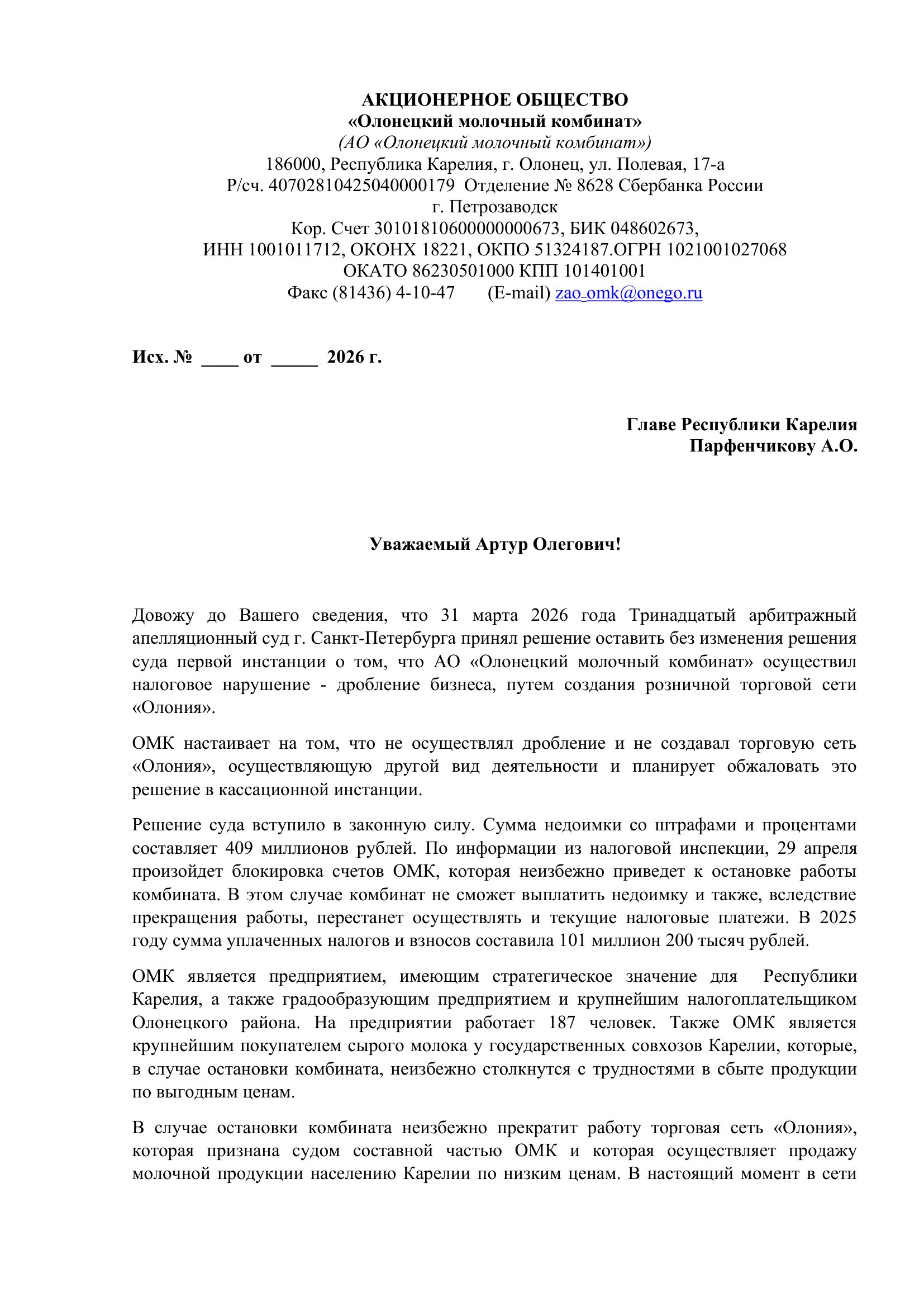 Директор Олонецкого молочного комбината Ольга Раздрогина 21 апреля направила обращение главе Карелии Артуру Парфенчикову. В нем она уведомила губернатора, что ОМК не согласен с решением Арбитражного суда Карелии и 13-го арбитражного апелляционного суда в Петербурге, которые признали предприятие виновным в якобы совершенном дроблении бизнеса с магазинами «Олонии» в целях уклонения от уплаты налогов.