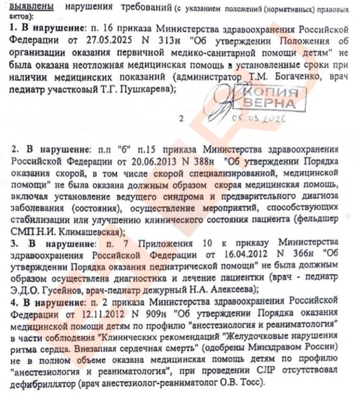Минздрав Карелии предоставил документы о проверке больницы Костомукши, где погибла двухлетняя Вероника Куминова. Акт проверки передали семье Куминовых и медицинскому юристу Юлии Липинской, которая представляет родителей. В действиях медиков обнаружили множество нарушений.