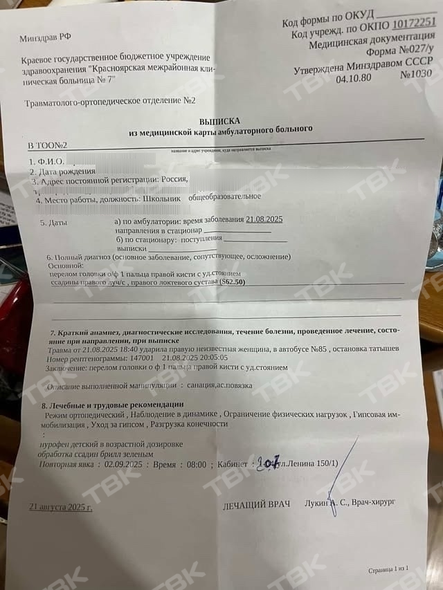 Мать 13-летнего подростка из Красноярска рассказала, что 21 августа ее сына в автобусе поколотила пожилая женщина. В анамнезе указано, что у мальчика перелом пальца и ссадины на теле.