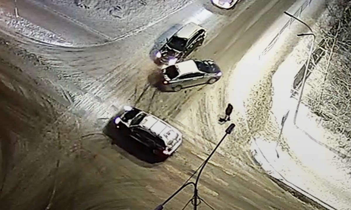 Сегодня утром в Петрозаводске на перекрестке улиц Ватутина и Мичуринской произошла массовая авария. Совсем рядом с тремя автомобилями двигался пешеход.