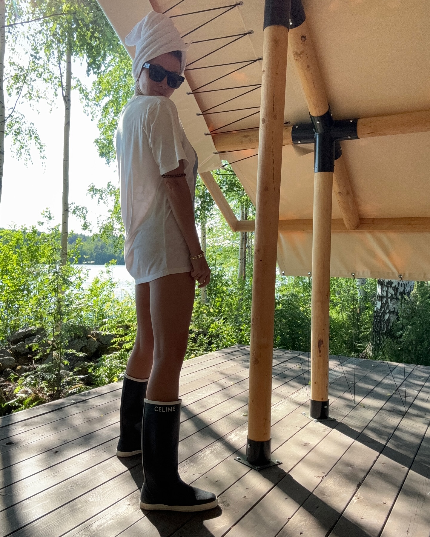 Модель и блогер Полина Диброва снялась в купальнике и сапогах на берегу Онего. Модель пожаловалась, что ей тяжело спать в палатке из-за обилия комаров и белых ночей.