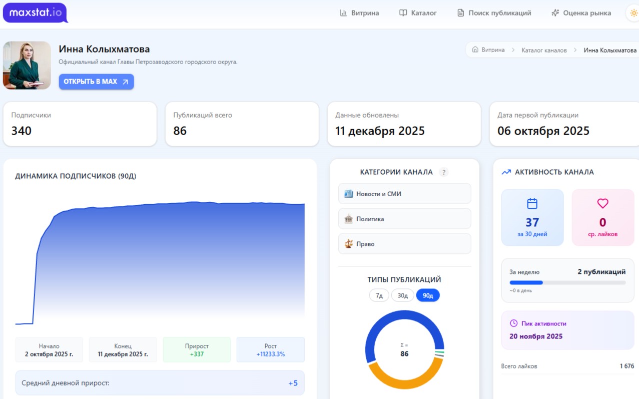 Мы сделали два нехитрых запроса в сервисе аналитики каналов в мессенджере MAX: «Петрозаводск» и «Карелия». На 11 декабря более тысячи подписчиков успел набрать единственный местный канал — губернатора Карелии Артура Парфенчикова. Правда, у него опубликовано более трехсот постов. В канале мэра Петрозаводска Инны Колыхматовой рост аудитории с октября составил красивые +11233.3%. А среднее количество лайков — 0. В остальных местных каналах — сотни, десятки и единицы фолловеров.