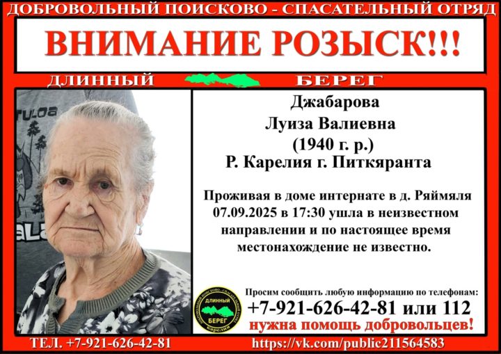 Также появилось фото одежды, в которой Луизу Джабарову видели в последний раз. Если вы видели эту женщину, сообщите по номерам: +7-921-626-42-81 или 112.