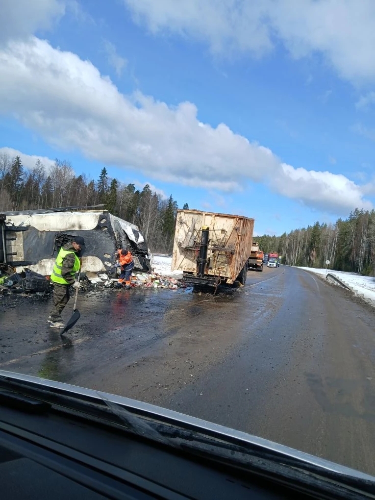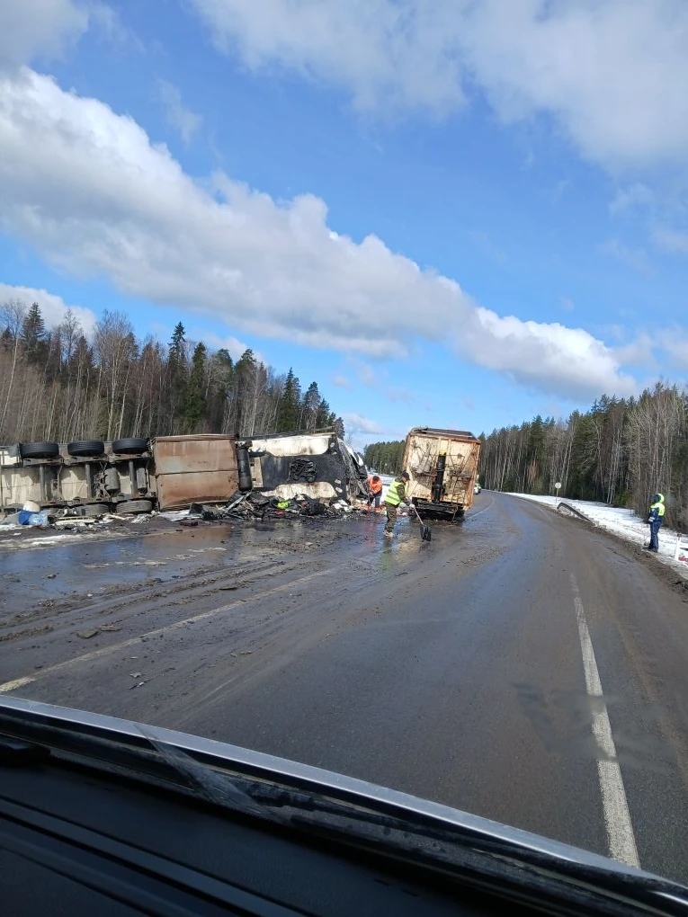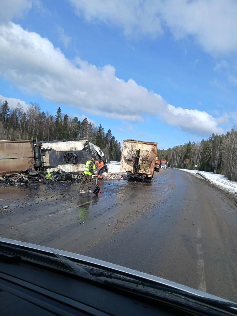 Сейчас на месте идет уборка дороги. Загоревшиеся грузовики до сих пор перкрывают одну полосу движения.