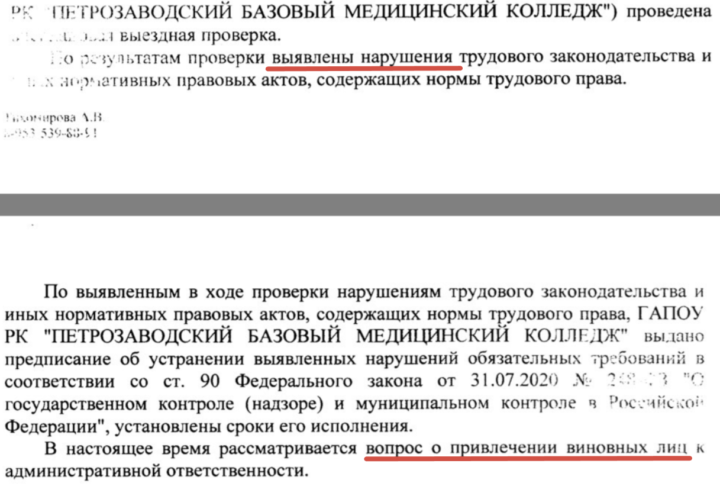 Позднее в правительстве Карелии сообщили, что проверка Минздрава Карелии и Государственной инспекции труда республики «нарушений прав работников колледжа при начислении и выплате заработной платы, в том числе за квалификационную категорию, не выявила».