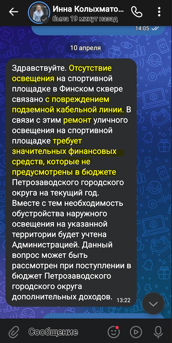 Мэр Петрозаводска Инна Колыхматова ответила читателю, что на ремонт освещения нужна значительная сумма, которую в этом году не нашли. Возможно, освещение отремонтируют, если в бюджет поступят деньги.