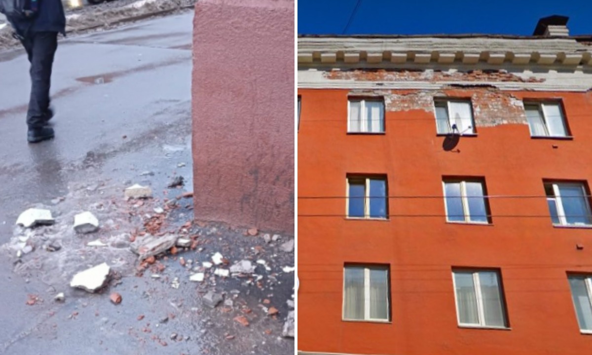 Куски штукатурки падают с фасада исторического жилого дома на проспекте Ленина, 37 в Петрозаводске. Они падают прямо на тротуар, сообщила «Столица на Онего».