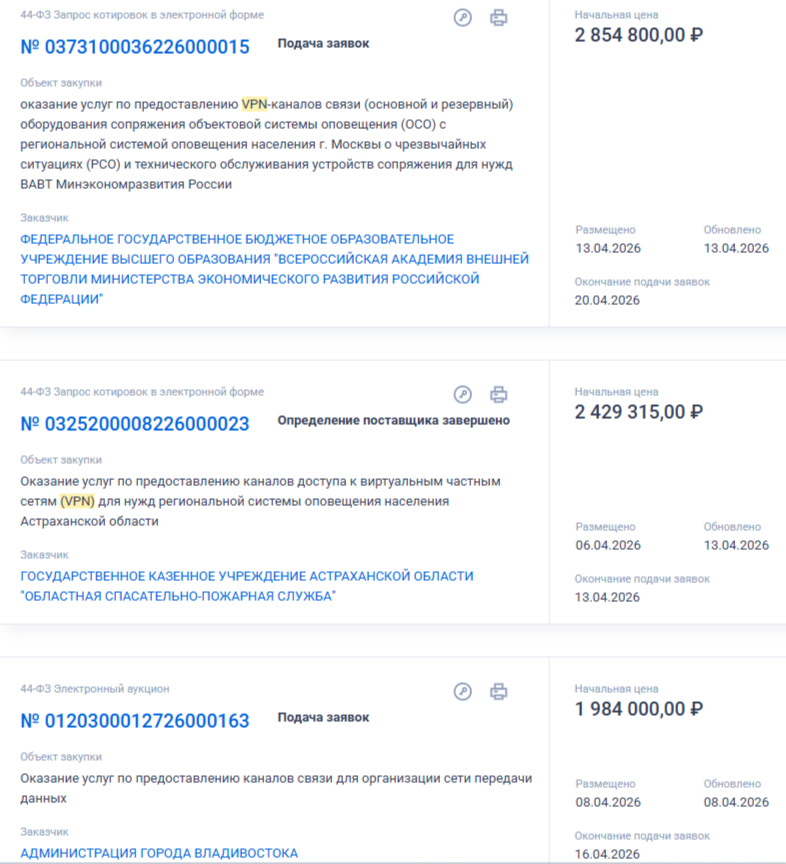 С начала 2026 года на сайте госзакупок появились минимум 374 аукциона на услуги с VPN. Как сказано в некоторых технических заданиях, услуга требуется для передачи работникам школ экстренной информации об опасностях, ЧП и военных конфликтах. В Воронежской области с помощью VPN организуют видеомониторинг лесных пожаров.