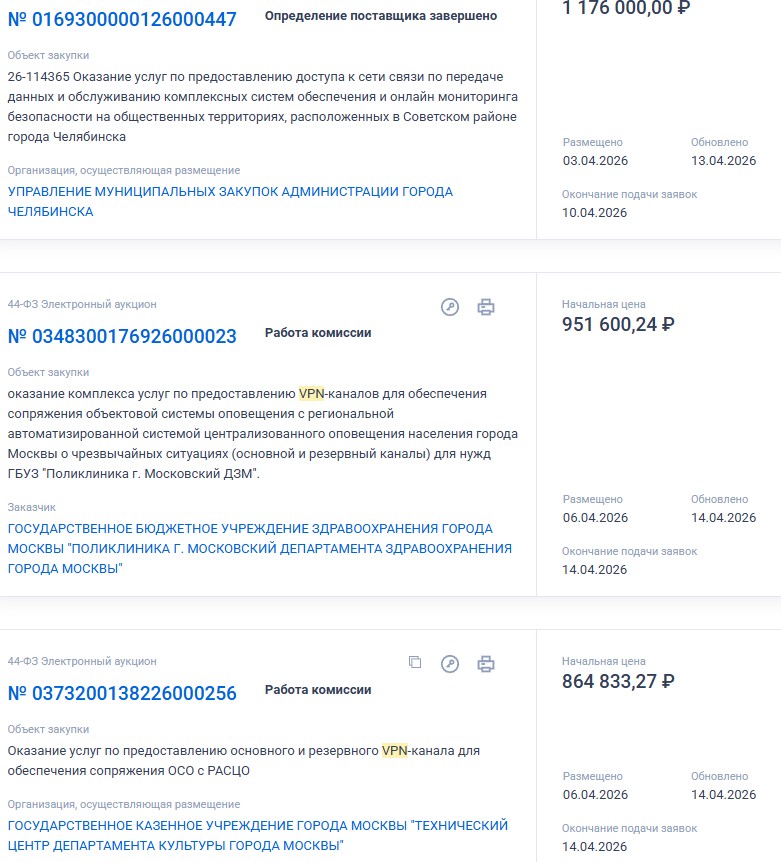 Как пишет Life, тендеры на оказание услуг VPN выложили региональные министерства, структуры Минобороны, МЧС и Минздрава, следственные управления СК РФ, городские и районные администрации, образовательные учреждения, метеослужбы, предприятия энергетики, местные водоканалы, МФЦ и заводы ВПК. Общая сумма закупок исчисляется миллиардами рублей и сулит сверхдоходы операторам, предоставляющим услуги VPN.