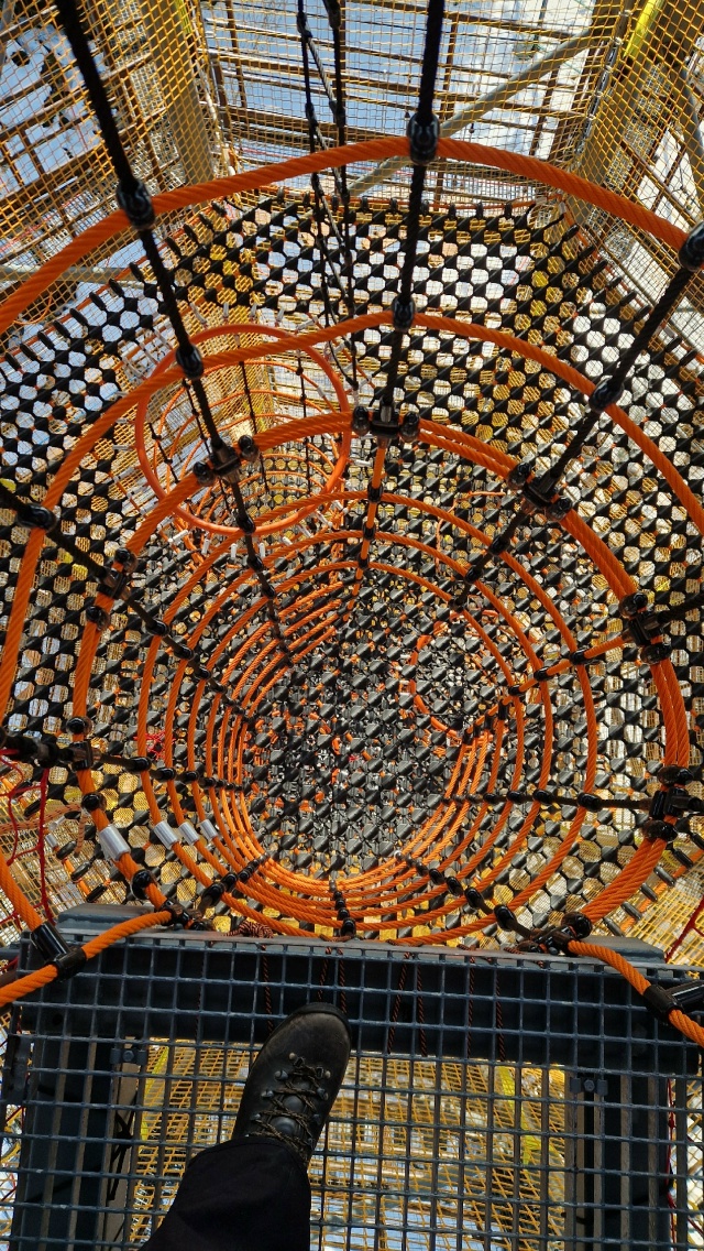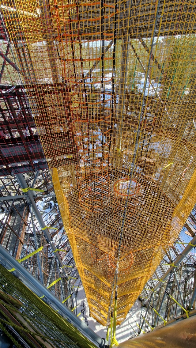 — На днях завершили монтаж центрального двадцатиметрового «стакана». Это один из способов спуска с окончания веревочных трасс: несколько этажей сетчатых полок, соединенных туннелями из крупноячеистых сетей для лазания. Такой спуск будет осуществляться уже без снаряжения, налегке, а страховочную функцию будут выполнять сети с двойной дублированной защитой, — рассказали в паблике «Рускеала экстрим Парк».