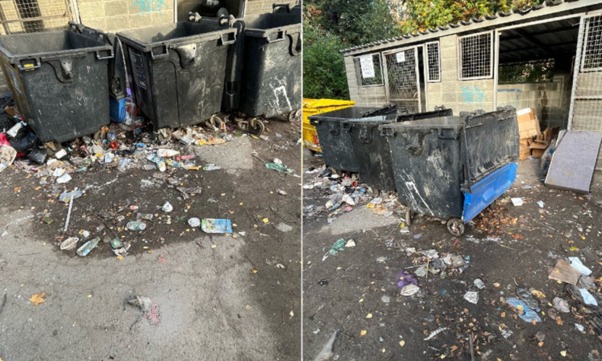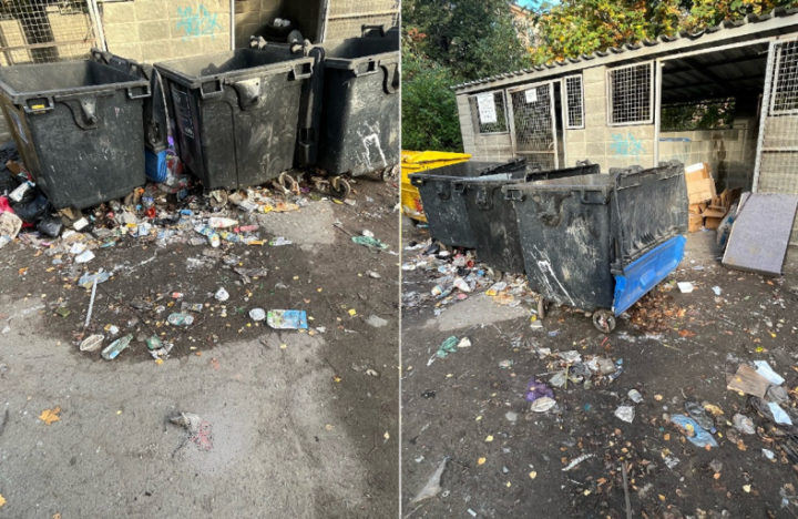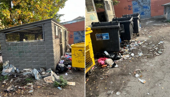 Контейнерная площадка превратилась в зловонную свалку, на которой можно снять фильм ужасов. На асфальте лежат трупы крыс, вокруг контейнеров разбросаны пакеты, пластиковые стаканчики и другой мусор.